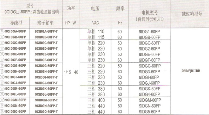 2、选型表中有颜色部分的型号为韩国国内(60Hz)用电机。