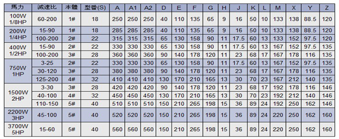 下图为城邦二代三相齿轮减速马达的详细参数: