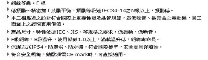 本三相馬達之設計符合國際上重要性能及品管規範,為低噪音、長壽命之電動機,具工 商業上之經濟實用價值。