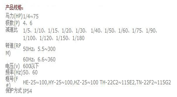 东元卧式电磁调速马达转速控制范围: ED马达仅需微小的控制电力,即可做广范围的无段控速,以闸流子方式的控速范围在连续运转时为10:1。转速变动率: ED马达转速变动率以下式表示转速变动率(%)=[(10%负载时转速—100%负载时转速)/ (100%负载时之最高转速)] ×100%ED马达负载转矩从100%全负载到10%之范围内变化,其转速变动率如使用ED控制盘,可在1%以下。若负载转矩在全负载转矩5%以下的轻负载时,其控制性欠佳,很难得到所需要的转速。ED马达的转速变动率可旋转控制盘内基板上之增益调整螺丝,做广范围的调整,可以得到在各种用途上所需控制特性。定转矩特性: ED马达定转矩电动机,不论转速的变化如何而它均能依负载的需要,将驱动电动机的转矩原原本本传送到输出轴,所以其输出轴的输出功率是与转速成比例增加,如转速减半,其输出亦减半。输出轴之输出为驱动电动机之输出减去ED耦合机的损失,此值在最高额定转速时,约为驱动电动机输出的80%。输出轴之转速: ED耦合机由于感应子与双重转筒之间有相对的转速差,才得将驱动电动机的转矩,传送到双重转筒上,故ED马达在负载联结时,必有若干程度的转差