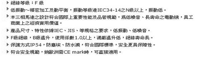 本三相馬達之設計符合國際上重要性能及品管規範,為低噪音、長壽命之電動機,具工 商業上之經濟實用價值。